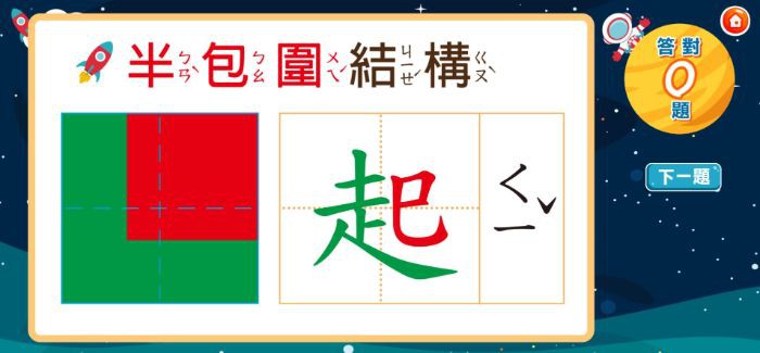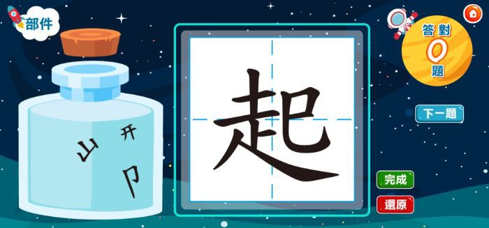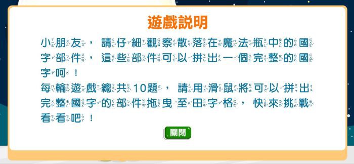 1.使用說明:以簡易的「拼字遊戲」方式讓學生觀察散落在魔法瓶中的國字部件,並拼出一個完整的國字,進而熟練各種國字部件組成。
