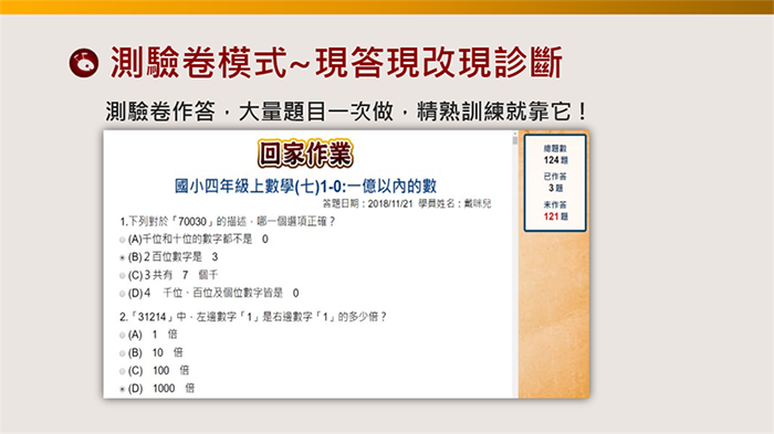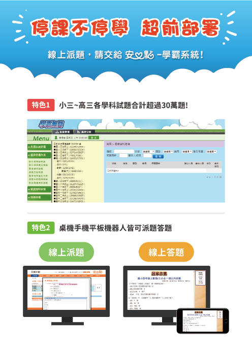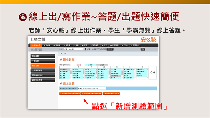 2.老師可使用本系統安心點”線上派題”功能,直接從超過30萬題的海量優質題庫中自行設定出題範圍與挑題,學生可透過平板或手機線上立即答題,答題後的成績同步上傳到老師與家長的測驗紀錄本