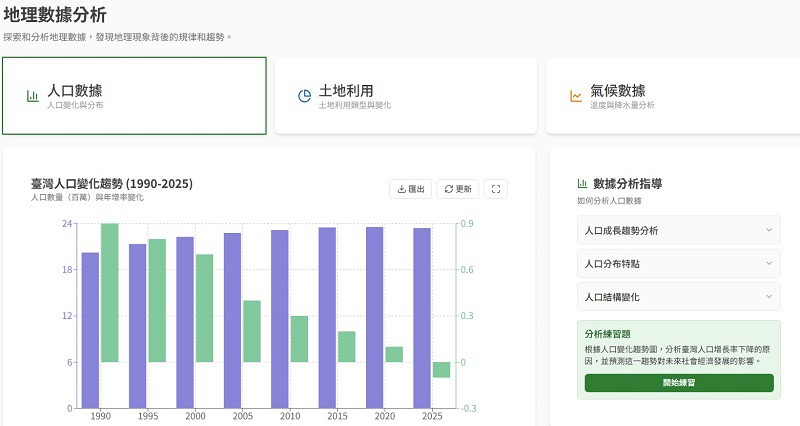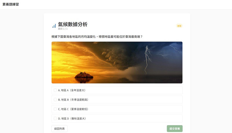 閃電AI地理教育系統是專為臺灣國高中學生設計的創新地理學習系統,旨在培養學生的地理素養和空間思維能力,幫助學生在小考、段考、會考和學測等各類考試中取得優異成績。本系統運用先進的地理訊息系統(GIS)、遙感技術和數據可視化工具,將抽象的地理概念和複雜的地理現象轉化為直觀的視覺體驗,幫助學生深入理解地理原理和規律。系統的核心功能包括「地圖判讀」、「圖資素養題練習」和「地理數據分析」三大模塊。「地圖判讀」模塊提供各類地圖的閱讀技巧和分析方法,包括地形圖、氣候圖、人口分布圖等,培養學生從地圖中獲取和解讀訊息的能力;「圖資素養題練習」模塊針對地理科目中常見的圖表分析題型,提供系統性的訓練和指導,提升學生的圖表素養;「地理數據分析」模塊則教授學生如何收集、處理和分析地理數據,培養數據思維和實證分析能力。此外,系統還提供「虛擬實地考察」功能,通過3D模擬和全景影像,讓學生足不出戶就能探索世界各地的地理環境和人文景觀。通過這套創新而全面的學習系統,學生能夠建立扎實的地理知識基礎,培養靈活的空間思維能力,在各類考試中脫穎而出。