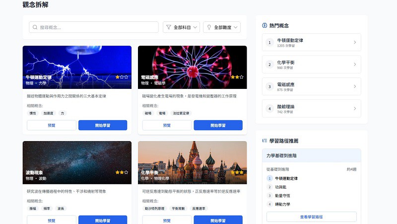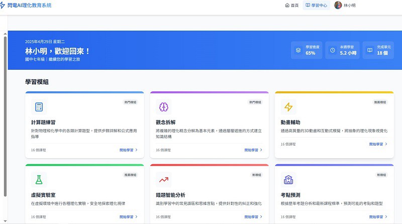 閃電AI理化教育系統是專為臺灣國高中學生設計的創新理化學習系統,旨在幫助學生突破理化學習中的抽象概念障礙,建立清晰的物理和化學知識體系,從容應對小考、段考、會考和學測等各類考試。本系統運用先進的人工智慧、虛擬實境和數據可視化技術,將抽象的理化概念轉化為直觀的視覺體驗,幫助學生深入理解理化原理。系統的核心功能包括「計算題練習」、「觀念拆解」和「動畫輔助」三大模塊。「計算題練習」模塊針對物理和化學中的各類計算題型,提供步驟詳解和公式應用指導,幫助學生掌握解題技巧;「觀念拆解」模塊將複雜的理化概念分解為基本元素,通過層層遞進的方式幫助學生建立完整的知識結構;「動畫輔助」模塊則通過高質量的3D動畫和互動式模擬實驗,將抽象的理化現象視覺化,幫助學生直觀理解。此外,系統還提供「實驗室模擬」功能,讓學生在虛擬環境中進行各種理化實驗,安全地探索理化規律。通過這套創新而全面的學習系統,學生能夠克服理化學習中的困難,建立扎實的理化基礎,在各類考試中取得優異成績。