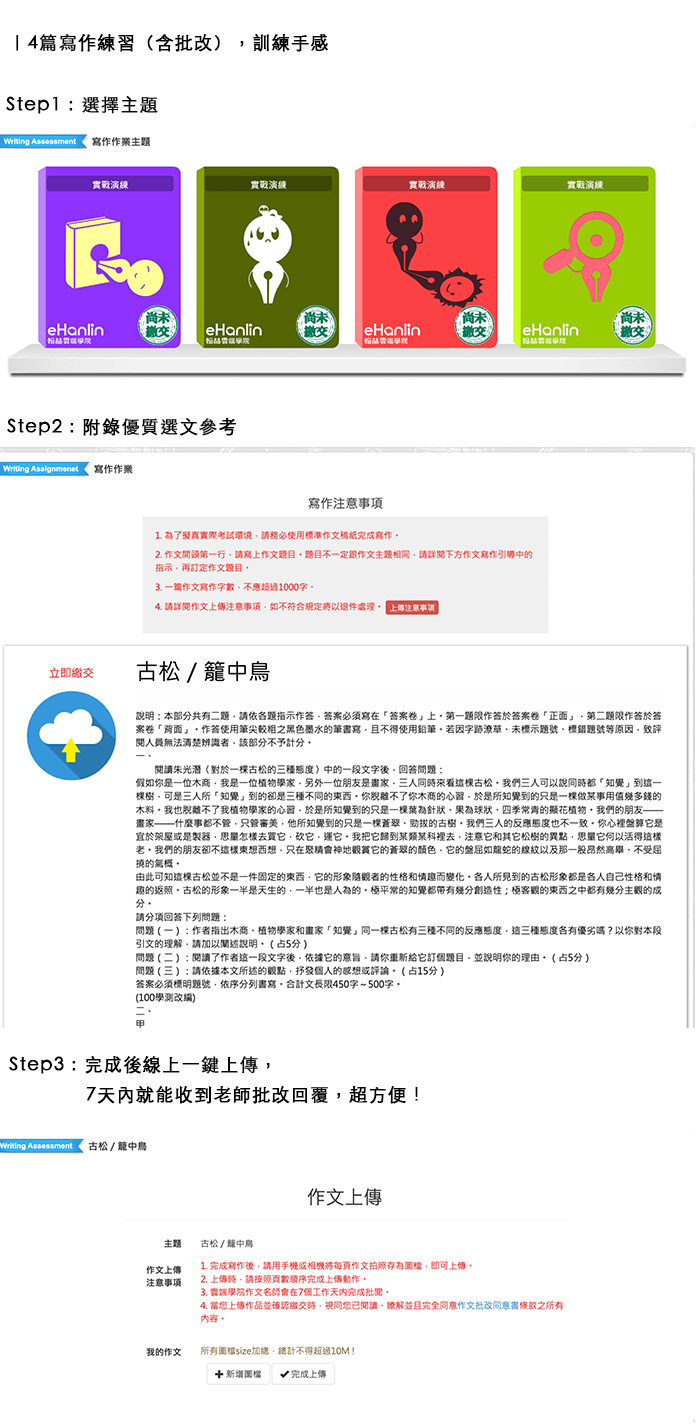 (3)線上批改:4大題目,透過精選範文了解寫作方向,再上傳作品讓專業的批改老師提供意見,只要一張照片就能線上批改,寫作進步看得到!