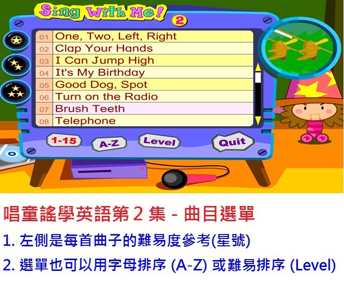 本產品為全互動式教學軟體,全部共50首,分為三集。