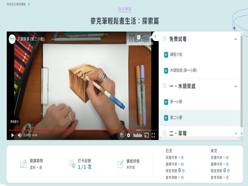 課程安排,有有簡單的木頭質感做筆法的應用。每次繪製的時間會慢慢的增加,難度也會從比如說從20分鐘到90分鐘不等。這門初階課程會從簡單的造型,並以色彩的練習為主。透過網路講義下載,例如圖稿與線稿。列印出來後,就可以跟著課程進行練習。每一個單元,老師都會一步一步帶著大家,從零開始學習麥克筆,一起進入色彩的遊戲世界。讓你畫出連自己都意想不到的成果喔!