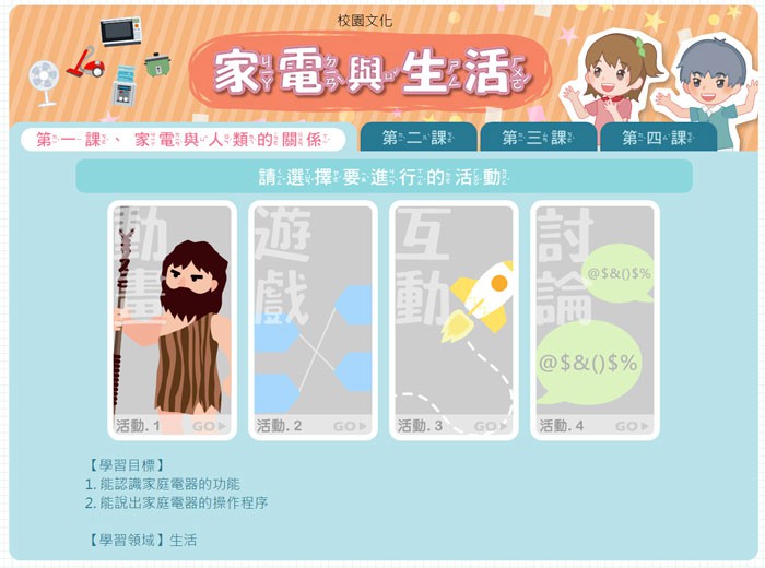 第一部分(第一課、第二課)從為什麼有家電、家電的功能和使用,延伸到智慧家電以及物聯網,一步步引導學生思考科技進步帶給生活的變化。