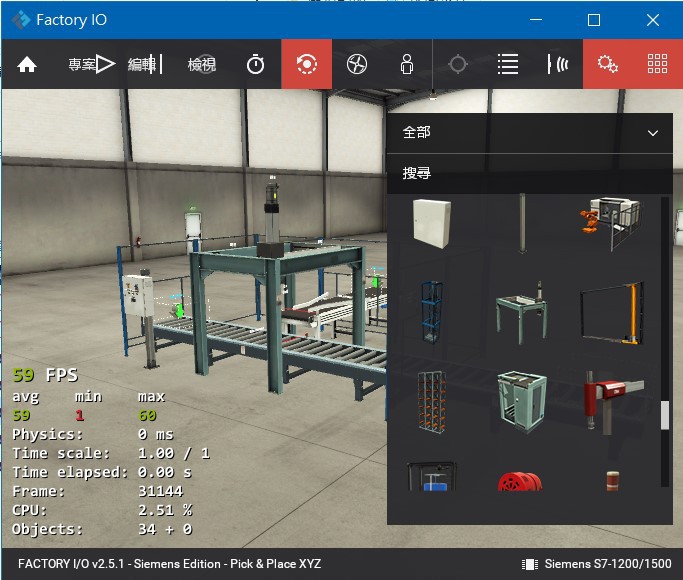 提供80個以上工業物件:當要發展新的場景時,3D虛擬實境工廠已經配置好工業物件的分類,共有八大類,其中包含傳感器、輸送機、電梯、按鈕、選擇開關、指示燈、塔燈、單軸汽缸、XYZ三軸平臺等等更多的物件。