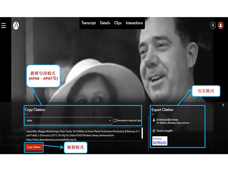 每支影片提供 : 引文資料格式包括 : APA、Chicago、MLA;永久連結網址、嵌入影片HTML 程式碼、英文字幕、逐字稿(可進行關鍵字檢索)、影片細節資料(摘要、導演、長度等等)、分享到社群媒體(Facebook, Twitter, Linkedin, Pinterest) ;最新功能 – 老師可以利用內建功能建立題目(選擇題、填答題、投票、討論等)作為評估和教學工具。