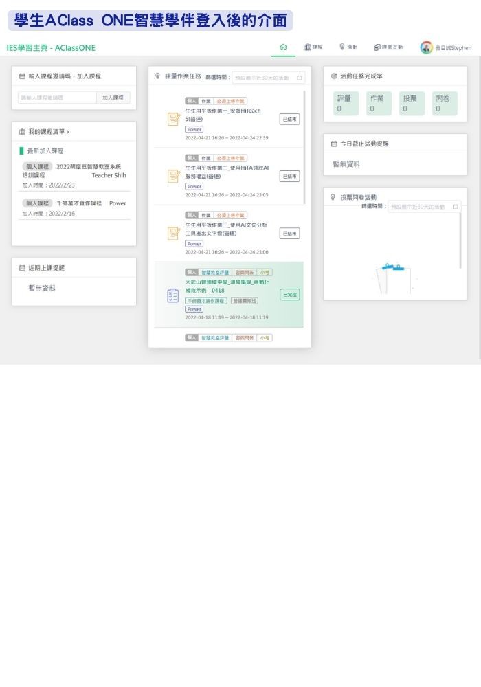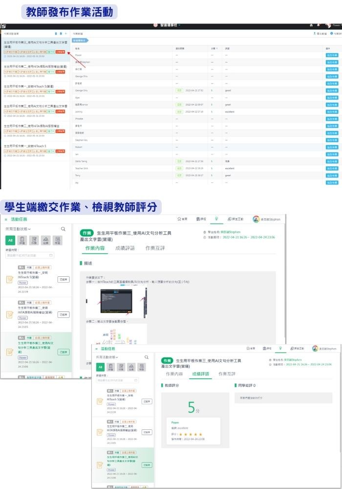 學生可於線上完成老師所指派的作業,形式非常多元,可以是純文字、圖片、影片、音檔或文件,並且進行同儕互評等等,達到多元學習之目的。