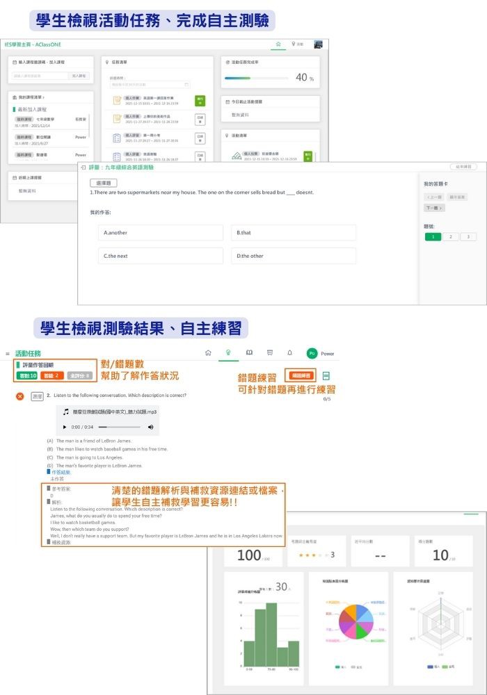 測驗題目支援聽力題與影片題,更有效地讓學生測驗練習,自主重複播放音訊、影片,學生聽得清楚、學得更多。