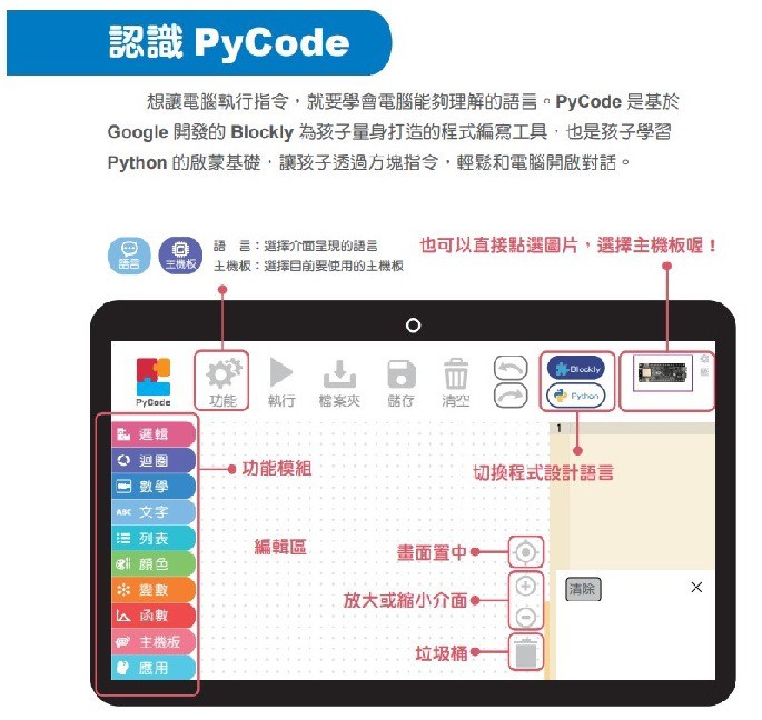 AI 小創客系列產品, 可以用電腦上的「PyCode」程式語言,來與主機板連線並操作執行。Pycode是由汯鉅科技自主軟體研發可以工作於桌上型電腦, 筆記型電及安卓和iOS平板. 詳細規格說明如下:
