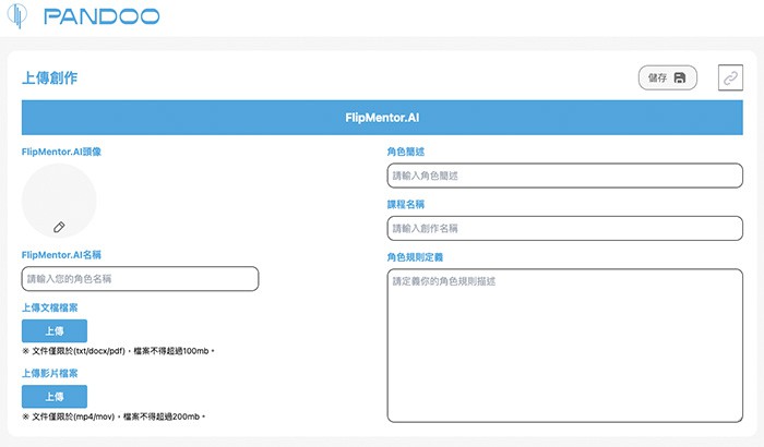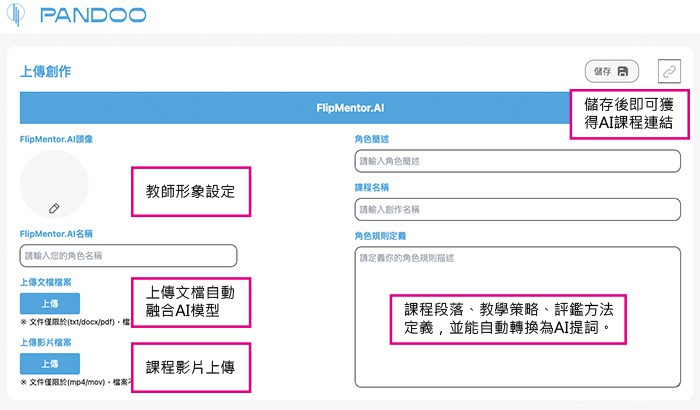在「教師課程編輯端」,教師可以輕鬆將預錄好的教學影片上傳到系統,作為課程的一部分。此外,系統支援多種文件格式,包括 PDF、Word 和 TXT,教師可直接匯入教學文檔,這些文檔將與語言模型結合進行深度訓練,從而增強課程內容的智能化表現。教師還可將教學方法、策略以及影片內容重點以文字形式建立,系統將根據這些內容生成具備教師個人風格與教學策略的 AI 提詞,最終形成可與學生互動的專屬虛擬教師。