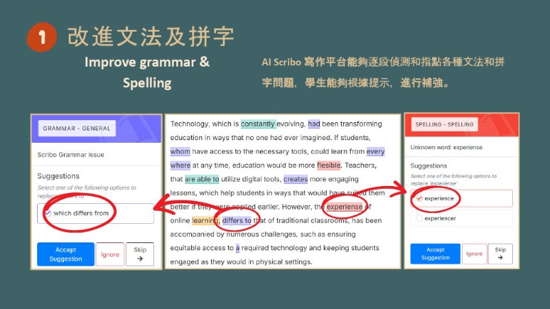 4. 即時性回饋:自動檢查拼寫、文法與標點,提升文章正確度。