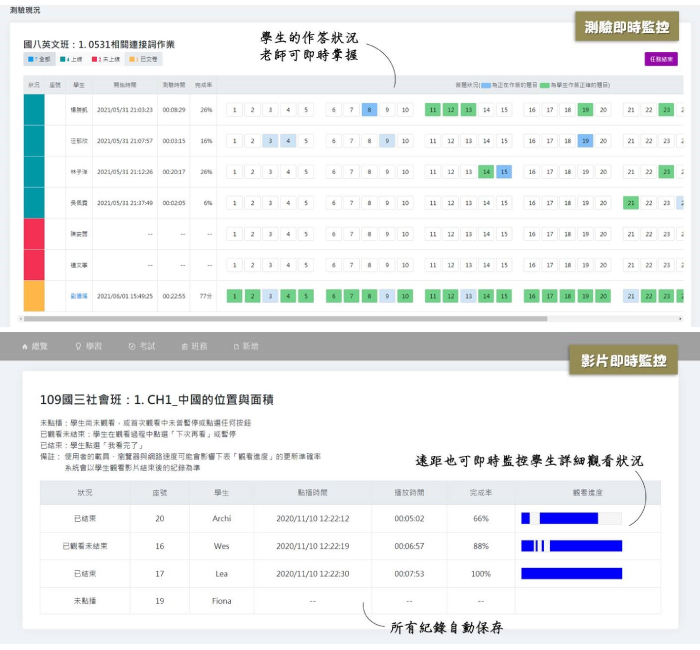 ●後臺管理監控功能,控管全校數據(包含使用狀況:全校教師、學生、班級使用數量及狀況,以及使用紀錄:測驗詳細紀錄、影片觀看詳細紀錄)