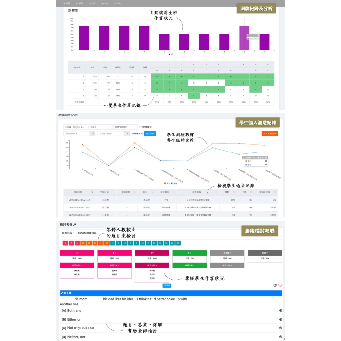 ●成績分析:測後成績立即回饋、系統自動分析知識向度及弱點(可遠端操作)。