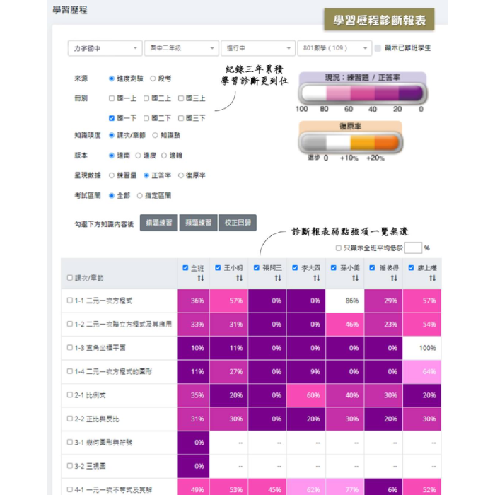 ●學習歷程:完整學習歷程可彙整學生個人三年學習狀況,大考前可針對弱點有效複習。