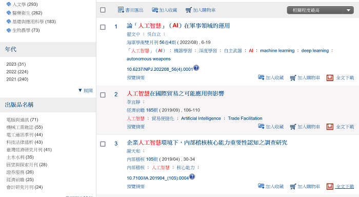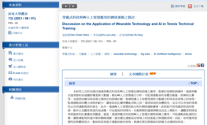 【最新功能!全文檢索】:提供查詢文章內文文字,呈現於查詢結果;有效減少因檢索詞未出現在標題、關鍵詞等欄位時,文獻被遺漏的可能。
