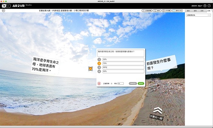 【專屬雲端空間使用】帳號1 年授權期間內,可將編輯完成VR 專案,上傳至雲端平臺,教師帳號可上傳10 組與替換專案,總容量200MB,學生帳號可上傳2組與替換專案,總容量20MB。