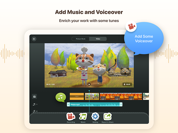 BOMO Story內建許多角色、場景、配件,你也可以自由發揮。編輯完故事後,你可以選擇將故事匯出為可印刷輸出的小手冊、PDF檔或是影片檔。BOMO Story內建影片編輯器,你可以在編輯器中錄製旁白或加入多個音效檔。