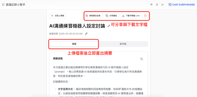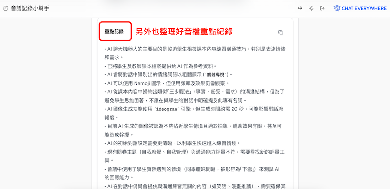 有了Chat everywhere會議記錄小幫手,讓每場教務(校務)會議都井然有序、重點分明,團隊溝通更高效!