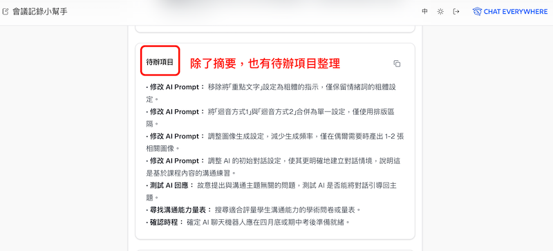 針對會議中的行動項目,自動整理成清單,方便團隊後續追蹤與執行。