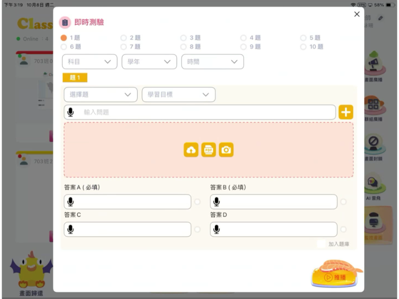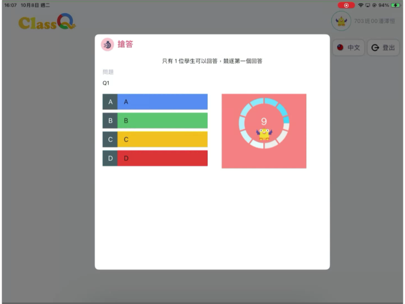 14. 允許老師發佈搶答題並推播至學生載具,另外搶答題有兩種模式:限第一位回答或是全班階可回答。學生提交答案及次序會自動儲存至雲端。