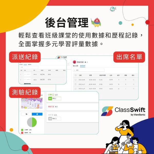 • 教師班級管理,多元學習評量數據:從後臺記錄每次課堂的日期、使用時間、出席、派送、測驗等重要資料,輕鬆管理教學歷程!