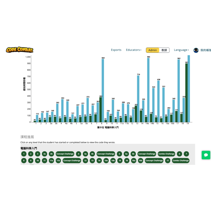 2.關卡式學習:每一個 CodeCombat 的關卡皆經過數據分析測試並調整,設計成最適合每位學生的模式。練習關卡提供提示,協助學生分析理解問題,挑戰關卡則可以自我評估學習狀態。
