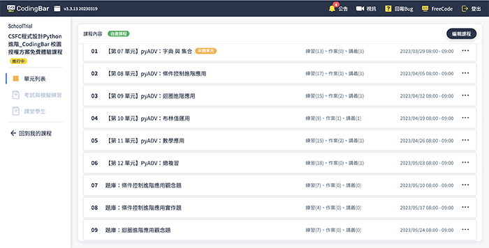 2. 搭配 CodingBar 程式設計雲端平臺,老師可以從教學資源庫中挑選題目舉辦線上考試或是模擬考(模擬考:在某個時間內,例如:8/1~8/30,學生可以重複多次參與考試,但考試的時間長度固定,例如:90 分鐘。但正式考試只能考一次),考試結束後系統會自動計算成績,並可以把成績匯出供老師使用。