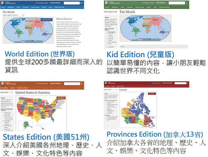 4.Kids Edition (兒童版 ) : 兒童版以活潑的介面,和簡單易懂的內容,讓小朋友輕鬆認識世界不同文化。