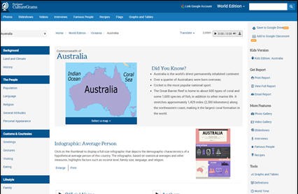 2.World Edition (世界版 ) : 收錄各國的歷史背景地理、氣候、人口、語言、宗教、禮節、飲食、娛樂、藝文、家庭、節慶等生活方式的資訊、還有經濟、教育、健康、交通等社會層面的資訊,甚至包含當地民眾的訪談。