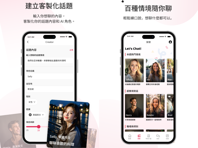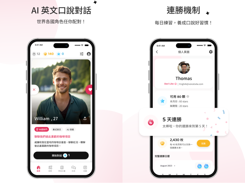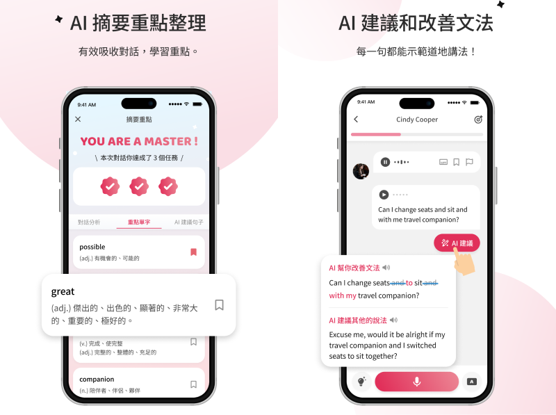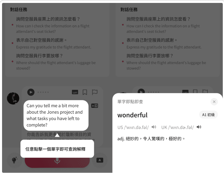 AI 口說分析:針對影片句子進行口說分析,比對每個單字中母音子音發音的精準度,矯正發音與增加口說熟悉度。