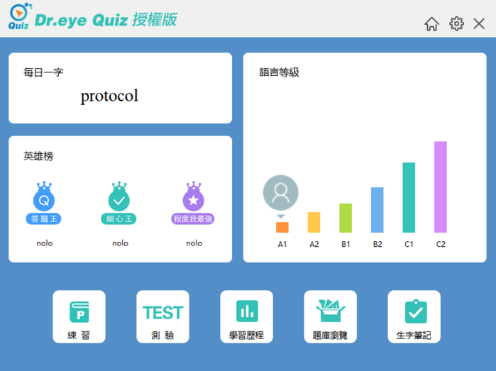 提供完整聽、說、讀練習,提供巨量自有題庫,提供管理者自建題庫匯入功能