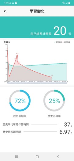 分析累積學習紀錄,包含學習時間、答題記錄等,並提供個人化學習曲線。依據用戶學習狀況隨時調整