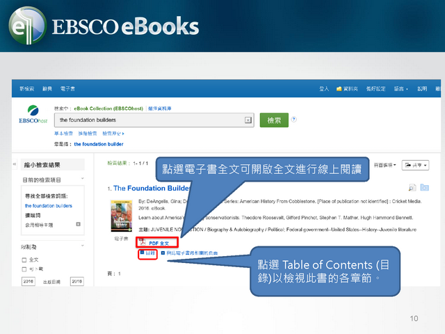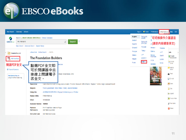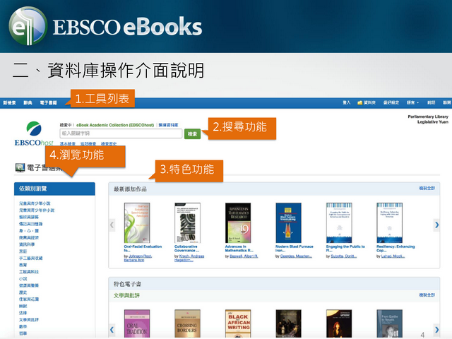 EBSCO 提供圖文並茂的故事書,透過OPAC即可直接登入EBSCO系統自由取閱。故事書以繪本的形式呈現,使內容更顯得生動活潑有趣,讓學生以輕鬆的方式進行學習,藉以提升英文閱讀能力,並在閱讀中養成主動查詢字義的好習慣,把學習變得更有趣,而不再只是被動的看課本背單字了。節省空間與人力,排架空間有限,電子書完全不佔空間,且無須自行編目、貼標及維護書本。直接用OPAC 讀者帳號登入即可使用,不限制同時間讀者數量。