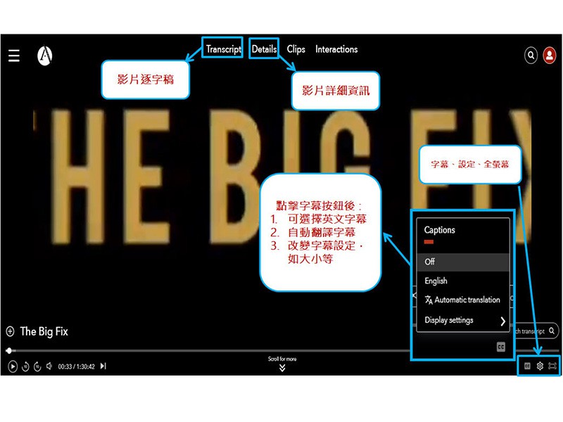 每支影片提供 : 引文資料格式包括 : APA、Chicago、MLA;永久連結網址、嵌入影片HTML 程式碼、英文字幕、逐字稿(可進行關鍵字檢索)、影片細節資料(摘要、導演、長度等等)、分享到社群媒體(Facebook, Twitter, Linkedin, Pinterest) ;最新功能 – 老師可以利用內建功能建立題目(選擇題、填答題、投票、討論等)作為評估和教學工具。