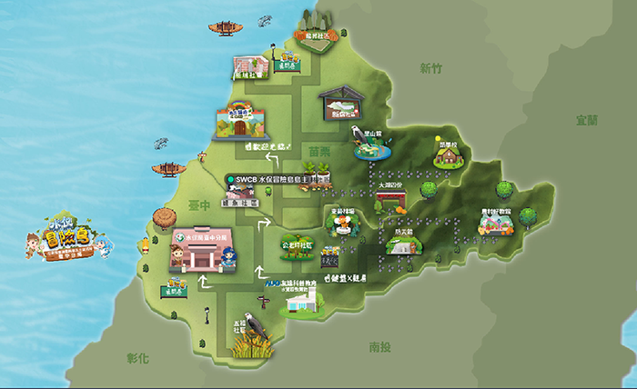 水保冒險島是本團隊隊協助行政院農業部農村發展及水土保持署-臺中分局於遠距社交平台Gather Town建立的線上虛擬空間,以中苗地區為中心點,並搭配七大亮點社區,如栗林社區、公老坪社區、鯉魚社區、獅潭社區、新埔社區、龍昇社區、五福社區。甚至擴充設立農村好物館、防災館、里山館,東勢林場、大戶四份兩處戶外教室與酷學校,總共16個場館,並且結合108課綱教材。10人以下即可免費體驗(本次紀錄於112年7月18日),師生們能夠直接在線上舉辦活動,觀賞水土保持相關影片以及知識等等。
