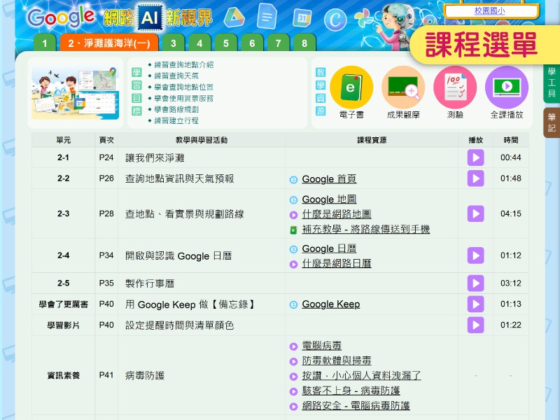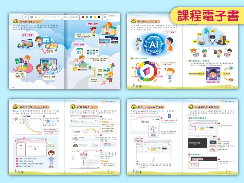 本課程兼以edge及chrome瀏覽器基礎的網路應用學習作為出發,完整學習Google豐富網路資源與工具:地圖、日曆、Keep、相簿、表單、試算表、文件、硬碟、協作平台,還有教你學會如何使用Canva線上設計簡報。結合生活化主題教學,再與時俱進的讓學生進入AI的科技領域,包括CODE.ORG專為小朋友設計的機器學習模型、Google限時塗鴉、音樂實驗室及AI聊天機器人等現階段的 網路AI最新的多元體驗。