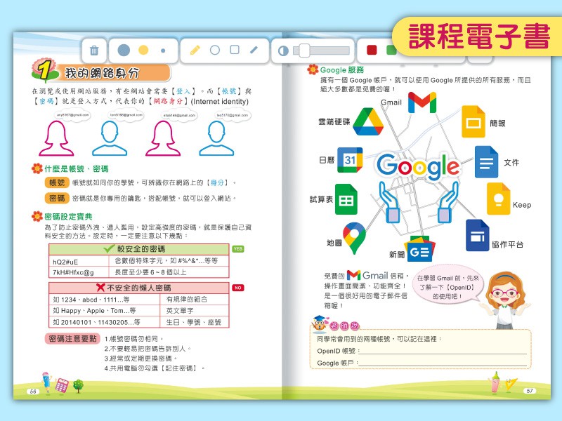 帶領學生自然而然地學會使用 Gmail 電子信箱、Google 雲端硬碟、Google文件、地圖、相簿、簡報等各項實用工具。每個主題設計簡單明瞭,圖文並茂、步驟清楚,搭配真實生活情境,讓學生在熟悉的情境中操作練習,潛移默化中提升數位素養與自主學習能力。不論是資訊課、專題課,甚至跨領域教學,都能輕鬆融入,是老師推動數位教學、培養學生未來力的最佳利器!