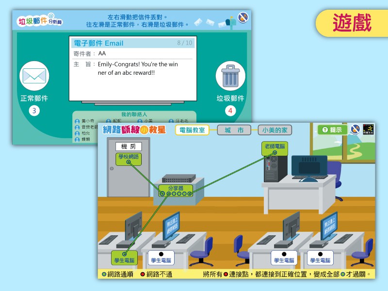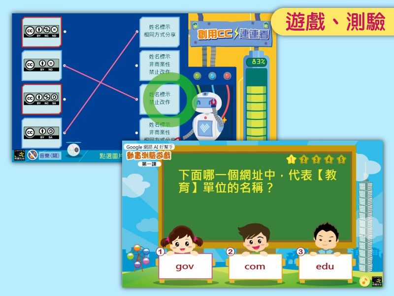 特別設計多款小遊戲,例如:網路斷線小救星、誰是 AI 機器人、垃圾郵件分析員、創用 CC 連連看…等,讓學生學習充滿樂趣。