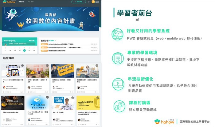 ✔︎ 多元數位學習內容:綜合十二大領域領域(音樂、語言、攝影、藝術、設計、人文、手作、生活品味、行銷、程式、職場技能和投資理財)高品質線上課程,符合新課綱趨勢,滿足各種學習增能需求。