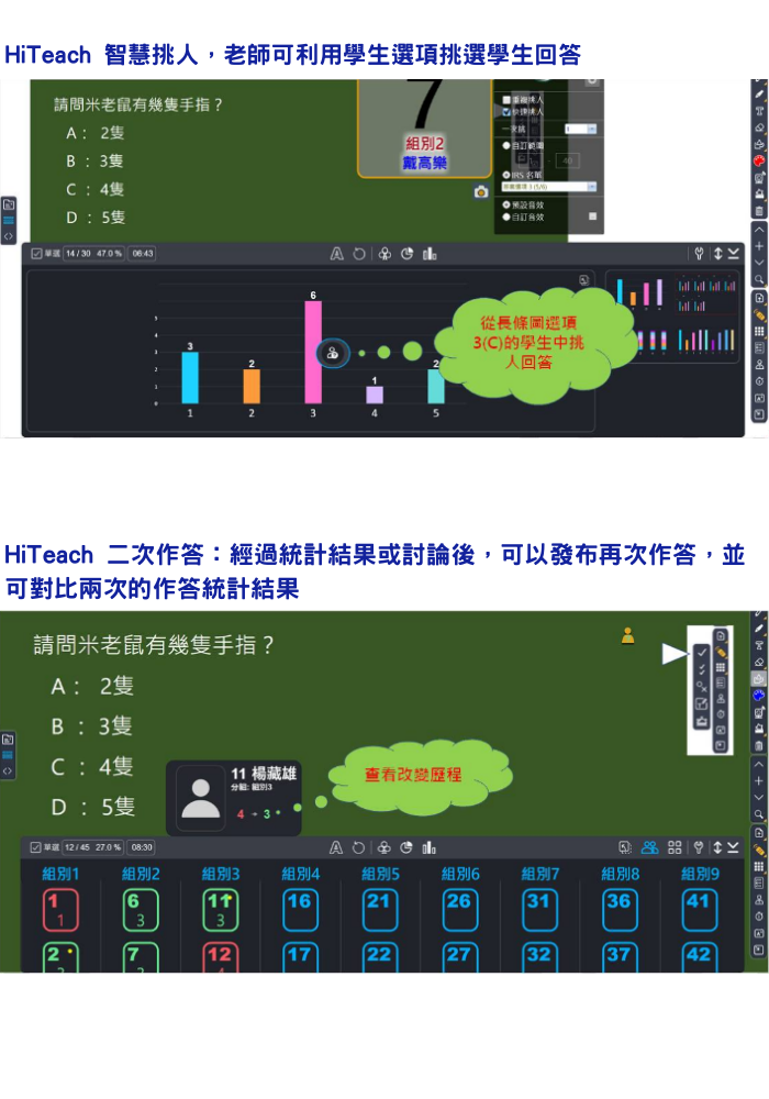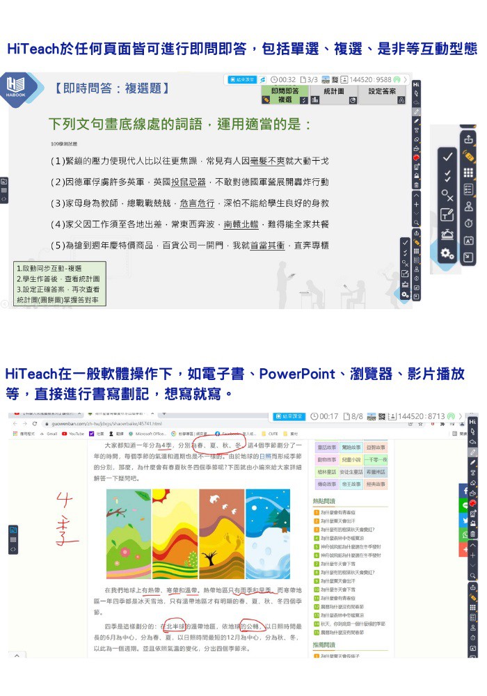 ●預設問答與搶權:可以使用「HiTeach題目設定工具」在PowerPoint簡報中,準備好預計穿插提問的問題,設定好題目的提問反饋類型(支援問答、搶權)、答案等,在HiTeach中匯入這份PPTX檔案進行簡報時,播放到有設定好問題的頁面就會自動顯示互動反饋區,請學生、學員或聽眾回答。