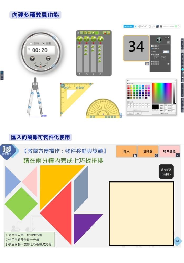 ●班級經營:課堂上最需要的挑人、計時器、記分板,HiTA可以隨時連線HiTeach,無線操作使用。