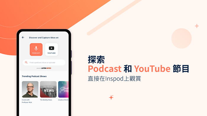 Inspod目前涵蓋Podcast與YouTube兩大串流平臺,可搜尋例如TED、Khan Academy等YouTube線上教學資源,或教師本身錄製的節目。觀看這些素材準備或預習課程時,可透過Inspod更好地整理重點。