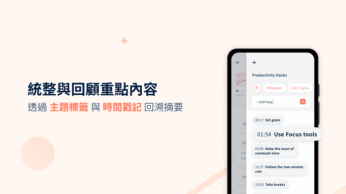 - 一鍵快速摘錄時間戳記,寫下筆記,並搭配項目符號條列