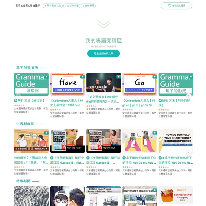 ✦ 獨創個人化閱讀區,學習者可專注在感興趣的主題!