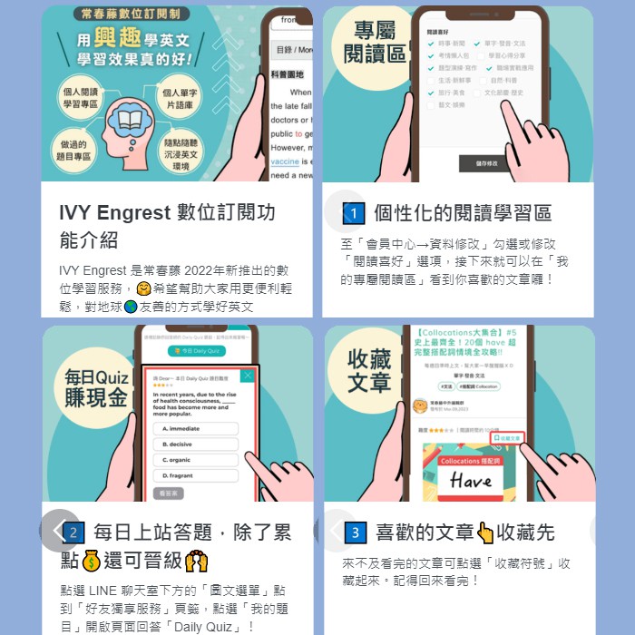 訂閱 IVY Engrest 能讓你從閱讀中挖掘興趣,進而學會更多單字、用法,再透過即時反饋並輸出分享,一步步轉動你的英文成長飛輪。~用興趣學英文。把英文變興趣~Turn English into your interest!!