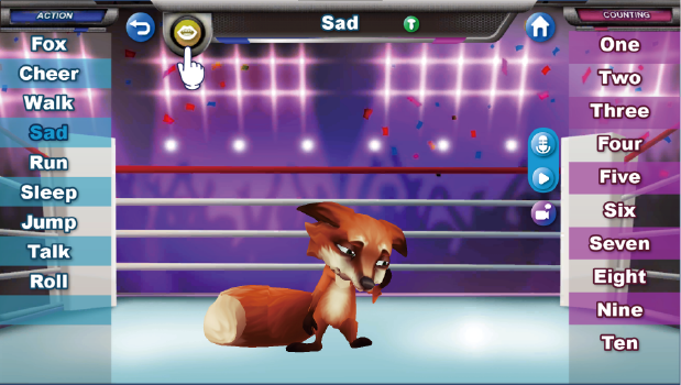 1.3D動態動物可依照學生的聲控指令開始表演,動作分成Cheer、Angry、Walk、Sad、Run、Kick、Sleep、Jump、Talk、Roll等。