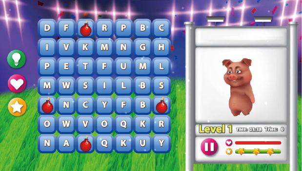 第三關(拼字評量):依序出現3D動態動物讓小朋友從字母盤中拼出正確單字。