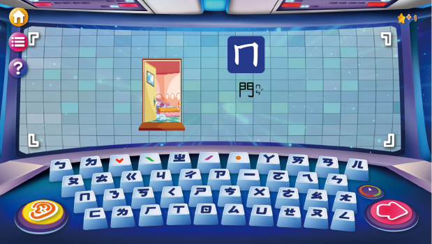 在太空中發出注音的信號,同學必須在駕駛艙鍵盤上按下相對應的注音符號,每次與太空聲音連結成功就會得到一個金幣,結合同學最喜歡的宇宙元素,讓學生在太空暢遊期間學習注音。