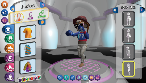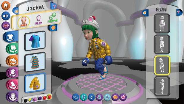 通過高自由度的角色創建系統,可以對人物的造型進行從膚色、眼睛大小、衣服、褲子、帽子、眼鏡到手套的細緻個性化設定,並且我們可以用點控或聲控系統幫人物換衣服,學習者可在這個過程中學到各式各樣相關英文字彙。