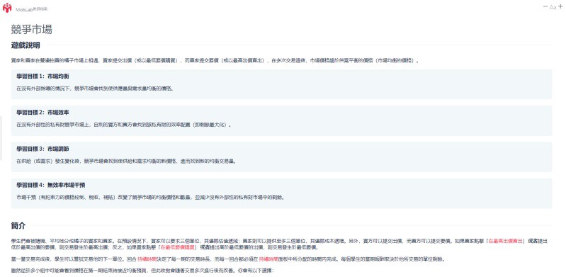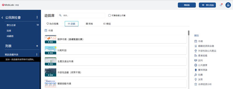 在過去幾年中MobLab陸續推出一系列應用廣泛的經濟學遊戲,從簡單的議價、矩陣賽局,到複雜的市場、競標和資訊群集。 這些遊戲所適用的學科包括經濟、政治經濟、賽局、金融,及管理學等等。學生可以選擇使用蘋果或安卓手機及平板電腦、或筆記型電腦參與課堂實驗。靈活直觀的教師介面可以讓老師在較短的時間內設置、運行、監控實驗,以及流覽和與學生即時分享實驗資料和結果。